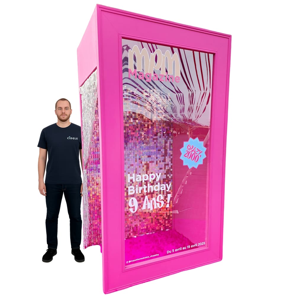 Inspirée d’un univers pop et coloré, la boîte Barbie photocall est un décor événementiel original qui attire immédiatement l’œil. Avec sa structure rose fuchsia, son intérieur pailleté et son style boîte géante, elle permet de recréer l’ambiance d’un packaging de poupée, parfait pour créer un point photo immersif et ludique lors de vos événements professionnels.