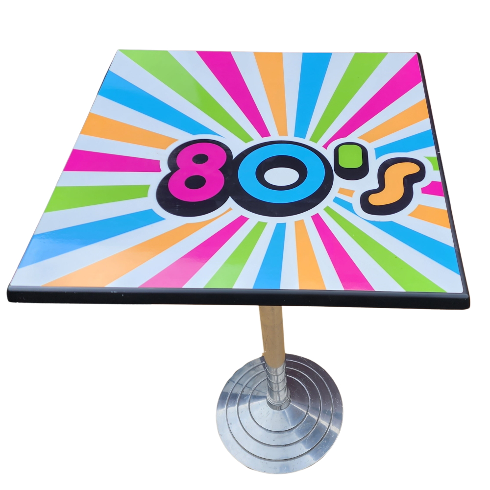Ce mange debout se distingue par son plateau carré décoré d’un visuel multicolore en étoile avec l’inscription « 80’s » en lettres épaisses, soulignées de noir. L’ensemble rappelle les codes graphiques de la culture pop des années 80, entre néon, synthétiseur et design exubérant. Le piètement métallique chromé assure une bonne stabilité tout en laissant toute la place au visuel du plateau, qui devient un élément central dans l’agencement de l’espace.
